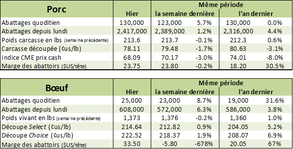La semaine dernière, les abattages de bœuf étaient de 608,000 bêtes, en hausse de 6.3% et 3.8% par rapport la semaine précédente et l’an dernier. Le poids moyen était de 826 lbs/carcasse ce qui est 0.8% de plus que l’an dernier. La production était donc de 500.8 millions lbs en hausse de 4.5% par rapport l’an dernier. Pour le premier trimestre, la production de bœuf fût de 4.4 milliards de livres, en hausse de 3.1% versus l’an dernier ce qui en-dessous des prévisions de +4.2% de l’USDA.
