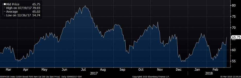 Après la sévère correction de la semaine dernière, passant de 72.00 ¢/lb lors des hauts de lundi à 67.00 ¢/lb à la fermeture de jeudi, le prix du porc récupère aujourd’hui avec un gain de +1.17 ¢/lb sur avril. Bien que la production continue d’être abondante, le prix des découpes rebondissait de +0.73 ¢ vendredi et +0.90 ¢ en matinée pour retourner au-dessus de 79 ¢/lb. Dernièrement, c’est le prix du jambon qui supporte la valeur de la carcasse à 65.75 ¢/lb, cela représente un gain de presque 10¢/lb en 3 semaines pour cette coupe qui constitue le quart de la carcasse. Fort possiblement que le rebond observé aujourd’hui (+3.62 ¢/lb) dans la valeur du jambon s’explique par le début des commandes pour Pâques, mais la demande reliée à cette fête devrait être principalement comblée d’ici la mi-mars, laissant un risque de voir les prix se replier vers la fin du mois. D’ici là, on s’attend à voir le prix des découpes se stabiliser près de la barre du 80 ¢/lb.