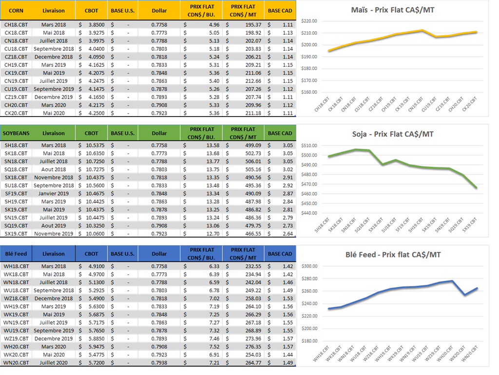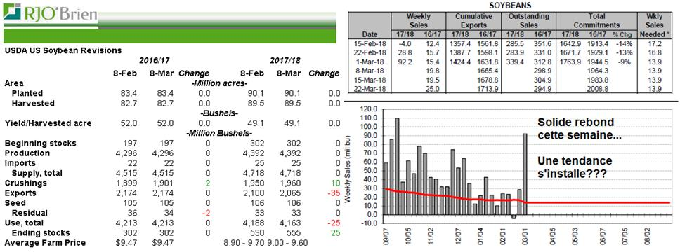 La force de l’exportation depuis le début de l’année a poussé le gouvernement américain à augmenter la cible d’exportation de 175 millions de boisseaux. C’est énorme, et plus que prévu. En fait ils l’avaient aussi augmenté solidement le mois passé et donc l’augmentation est de 300 millions de boisseaux depuis février. Le massif retard de l’automne est en train de s’effacer pas à peu près. Ce me rappelle la remontée des Canadien contre les Rangers il y a une couple d’année (Mon dieu je pense que ça fait 10 ans! On vieillit). L’exportation est extrêmement solide car 1) seul les américain ont du corn à vendre actuellement 2) les prix étaient relativement faible cet hiver pour favoriser l’utilisation et 3) il est fort probable que le Brésil/Argentine en récolte moins cette année. Bref c’est comme ma femme qui achète 10 canne de soupe Campbell quand ils sont en spécial en me disant « Ca s’perd pas tsé ». Elle a absolument raison, merci Chérie. D’ailleurs l’USDA a été très (très, TRÈS) généreuse dans son évaluation de la récolte Brésilienne de maïs car la mini révision à 94.5 millions de tonnes est loin de celle de CONAB (l’équivalent du USDA au Brésil, disons) est à 87 million de tonnes. En combinant Argentine et Brésil il m’apparait possible que les inventaires de l’Amérique du sud soit 8-10 millions de tonnes surévaluée par l’USDA. Si c’est le cas, la forte exportation qu’on a depuis le début de l’année risque de se poursuivre et ce sur la prochaine récolte 2018/19 car cela va prendre un an avant que l’Argentine/Brésil ne revienne sur le marché d’export (je calcul printemps 2019, s’ils ont une bonne récolte).