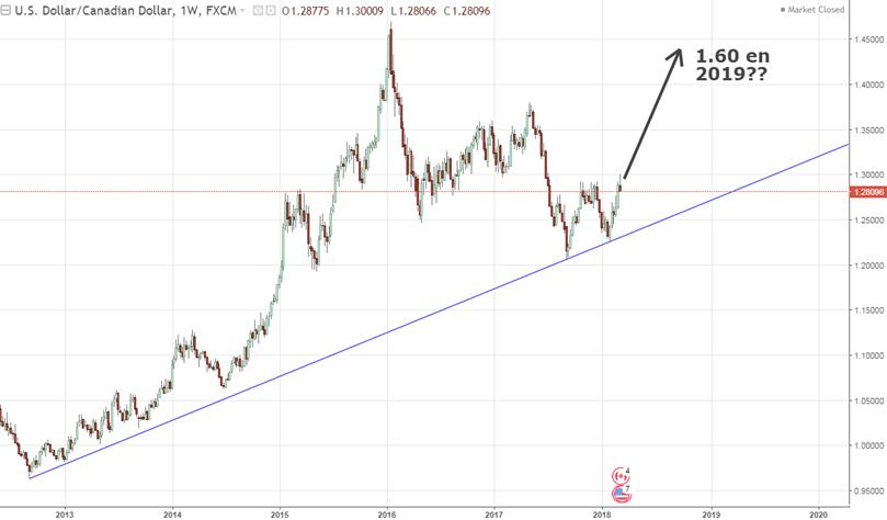 Ce matin les statistiques d’emploi aux USA étaient très bonnes; création de 313 milles jobs alors que le marché s’attendait à 200 milles. Ça roule aux States. Au Canada les chiffres d’emploi n’ont pas épaté la galerie, somme toutes en ligne avec les prévisions. Normalement je me serais attendu de voir le $US gagner contre notre huard mais ce n’est pas le cas. La raison est simple; les cours du pétrole en hausse de 2$ le baril à New York. On entend que plusieurs exploitation pétrolière ont 60$ le baril comme seuil de rentabilité alors les prix sont bien soutenus à ce niveau. Ceci étant dit je pense que le plus pertinent à lire dans le dollar canadien c’est qu’un analyste a publié cette semaine comme quoi il mise sur une super chute de notre monnaie. Naturellement les journaux en ont parlé; TVA nouvelles, LaPresse, etc… Naturellement des prédictions comme celle-là ca vend des journaux. Je ne dis pas que c’est impossible, mais cela prendrait une suite d’événements et d’hypothèse qui reste à voir. Naturellement le premier banc des accusés : l’ALÉNA. Oui, d’accord, on le sait. L’ALÉNA est très important pour notre économie et juste le fait d’en parler fait planter notre monnaie. Cela serait une grossière erreur d’ignorer le risque que ce la pose. Je l suis le premier a être fébrile dès que les USA/Trump parle de l’ALÉNA. Aussi, l’analyse graphique à long terme suggère un dollar canadien faible face au US. Graphiquement la tendance « long terme » est toujours intacte malgré les variations de 2016-2017. Ça reste à voir, l’avenir le dira mais je suis persuadé que pour avancer cela, M Taylor un ancien gestionnaire de fond mise sur 1) le retrait de l’ALÉNA, une récession au Canada et un respect aveugle de l’analyse graphique. Ça serait cool qu’il prédise la coupe Stanley à Montréal! Et les numéros du Lotto-max (mais il le dit juste à moi).