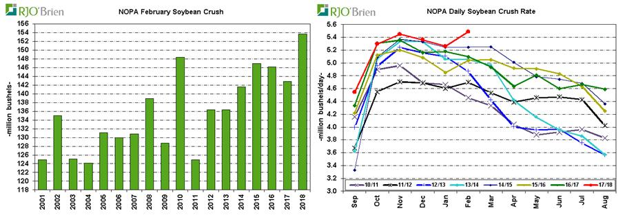 En février, NOPA a rapporté une trituration de 153,7 millions de boisseaux, soit un record pour le mois de février, dépassant le record de 148,4 millions de boisseaux en février. C’est 7,7% de plus que l'an dernier, avec 142,8 millions de boisseaux. Le crush en février était nettement au-dessus de l'estimation commerciale moyenne de 149,4 millions de boisseaux et a même dépassé l'ensemble des idées du marché de 145,2-153,4 millions de boisseaux.