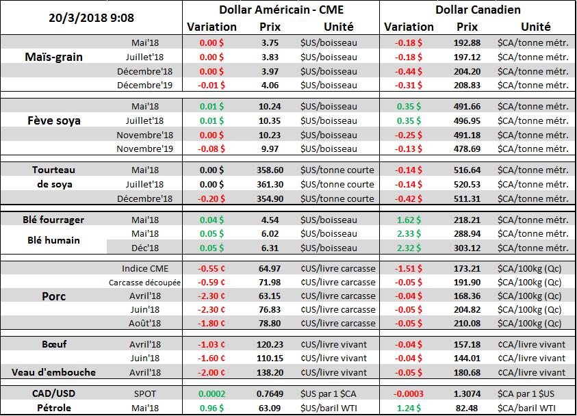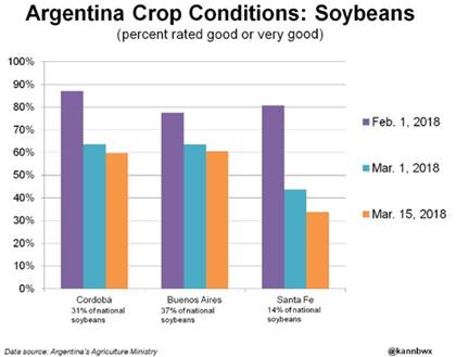 Après les résultats du NOPA crush la semaine dernière qui démontrait des volumes de trituration record en février, les prévisions météo publiées ce weekend en Argentine ont donné un deuxième motif pour vendre le complexe oléagineux. Bien que les dommages de la récolte de soya en Argentine seront en grand partie irréversible, les précipitations des derniers jours (et celles à venir) permettront de limiter l’amplitude des dommages. Les plants de soya sont au stade de « remplissage des gousses » pour environ le trois-quart des superficies de Buenos Aires et Cordoba, l’eau est donc très bénéfique à ce stade! On note aussi que la condition des cultures de ces 2 provinces lesquelles compte pour le deux-tiers de la production du pays, s’est peu détériorée dans la première moitié du mois de mars et demeure au-dessus de 60% bonne-excellente (voir tableau). Les dommages sont définitivement plus importants dans la province de Santa Fe (14% de la production) ce qui explique la révision des prévisions de la Bourse d’Argentine à 40 millions tonnes. Bref, la production d’Argentine ne devrait plus se détériorer. Pendant ce temps, on continue à se demander si la récolte de soya du Brésil et les surfaces 2018 aux États-Unis fracasseront le record de l’an dernier, tous deux considérés négatifs pour le prix.