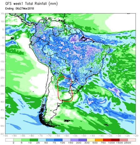 Précipitation prévue du 21 au 27 mars en Amérique du Sud