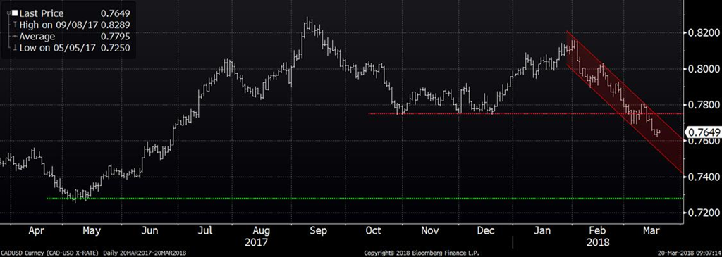 Le dollar canadien est toujours dans sa tendance baissière, mais commence à se stabiliser autour de 0.765 $US depuis 3 jours. Le marché de devise est moins volatile dans l’attente du discours de la Réserve Fédérale Américaine demain après-midi. C’est pratiquement certain selon les économistes que la FED augmentera le taux par 0.25% lequel se situera dans la fourchette de 1.50 à 1.75%. Puisque cette hausse est déjà incorporée dans les marchés financiers, il ne devrait pas avoir d’impact sur les marchés lors de l’annonce. Ce que les économistes regarderont est principalement les projections des futures hausses de taux (dot plot) pour 2018-19 ainsi que le ton que prendra Powell lors de son premier discours sur les taux d’intérêt. Est-ce qu’il sera plus agressif que Yellen? C’est qui sera important et devrait faire bouger le taux CAD/USD demain après-midi.