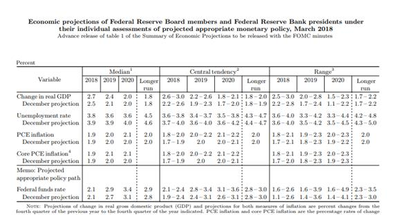 Tout d’abord la réserve fédérale a augmenté les taux comme prévu de 0.25% et passe maintenant à 1.50/1.75%. Bravo, la première hausse des taux de l’année est faite, reste à voir s’il va y en avoir 2 ou 3 autres cette année. Dans son discours et le communiqué on comprend que la Fed veut rester accommodante (taux faible) et c’est une des raisons que le dollar américain s’est replié. J’ai été un peu surpris de voir le langage rester « accommodant » car au même moment la Fed a rehaussé les perspectives de croissance avec un PIB revu en hausse de 0.2% à 2.7% cette année. Même son de cloche avec la vigueur de l’emploi avec un taux de chômage en baisse à 3.8%. Par contre malgré ces statistiques boostées la Fed ne s’attend pas à une surchauffe de l’inflation – on lit les projections stables à 1.9%. Eh bien. Ça me surprend un peu car normalement si l’économie va bien, l’emploi va bien, normalement l’inflation suit. Certains investisseurs doivent penser la même chose que moi avec les contrats d’or en hausse de 20$ l’once car dit souvent de l’or que c’est un actif utiliser pour contrer l’inflation.