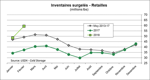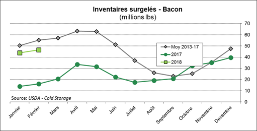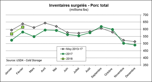 À la fin février, les inventaires surgelés de porc étaient en hausse de 8.3% par rapport le mois précédent à 615 millions lbs, c’est 6% de plus que l’an dernier à pareille date. L’augmentation par rapport février 2017 est principalement expliquée par les inventaires de flanc qui sont de retour à un niveau normal, à 46.5 millions lbs comparativement à 16 millions l’an dernier. Il y a aussi les inventaires de retailles qui ont subitement explosé en février, à 59.4 M lbs, c’est 59% de plus que l’an dernier.