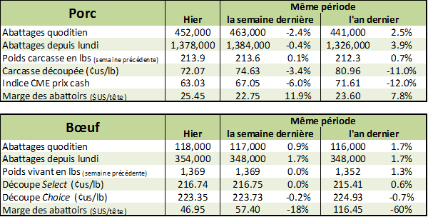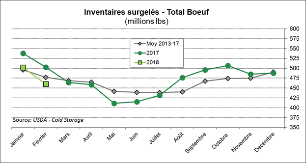 À la fin février, les inventaires surgelés de bœuf était à leur plus bas niveau depuis 2014 pour cette période de l’année. Avec un total de 460 millions lbs, c’est légèrement en-dessous de la moyenne quinquennale et c’est 8.4% de moins que l’an dernier. Ce recul des inventaires surgelés explique pourquoi la valeur des découpes est si élevée depuis quelques semaines. Pour toutes les viandes rouges, les inventaires surgelés totalisent 1125 millions lbs, c’est légèrement supérieur à l’an dernier (+1%) et seulement 2.4% sous la moyenne 5 ans.