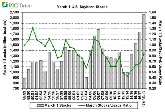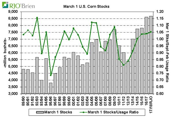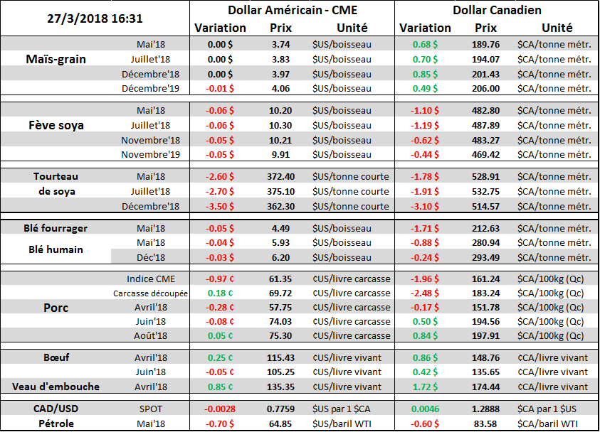 · Les estimés des inventaires au 1er mars placent celles-ci à un record historique pour le 2e trimestre de cette année, à 2.064 milliards de boisseaux, comparativement à 1.739 milliard l’an dernier.