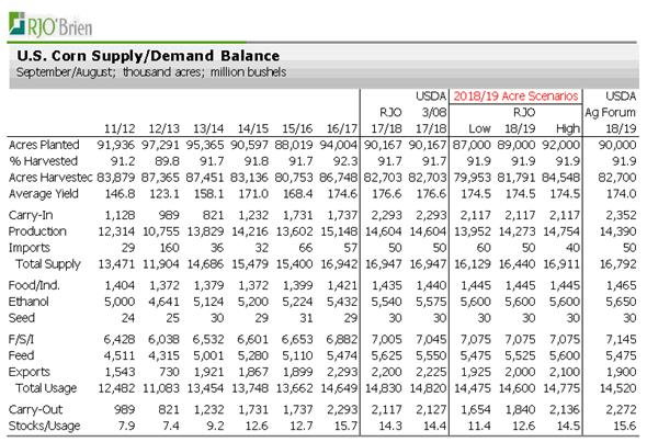 o Maïs : estimés à 89.4 millions d’acres (90.17M en 2017)