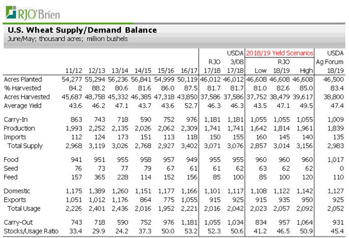o Blé Printemps : estimés à 11.5 millions d’acres (11.0M en 2017)