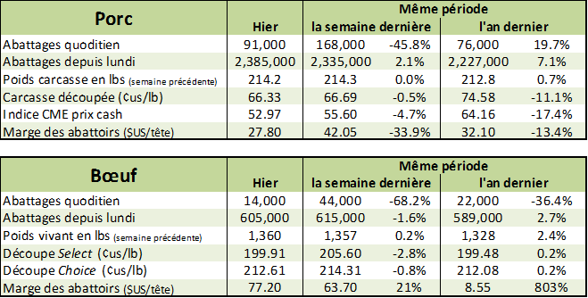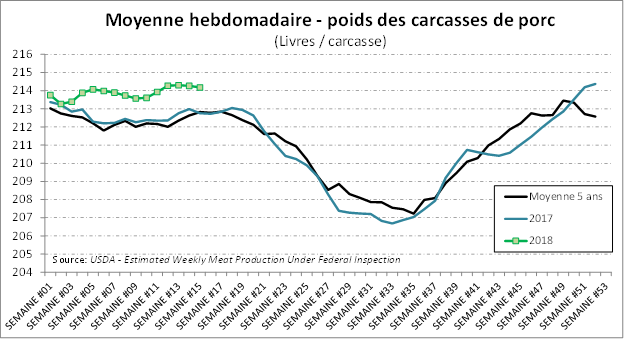 Selon l’USDA, les abattages étaient de 2.385 million de têtes la semaine dernière, une hausse de 2.1% par rapport à la semaine précédente où la production avait été affectée par le congé de Pâques. S’il l’on compare à il y a deux semaines, le rythme d’abattage est sensiblement inchangé et demeure très élevé. Avec un poids par bête qui continue de se maintenir au-dessus de la tendance historique saisonnière, à 214.2 lb carcasse, la production moyenne des 4 dernières semaines est en hausse de 4.1% par rapport à l’an dernier.
