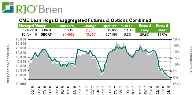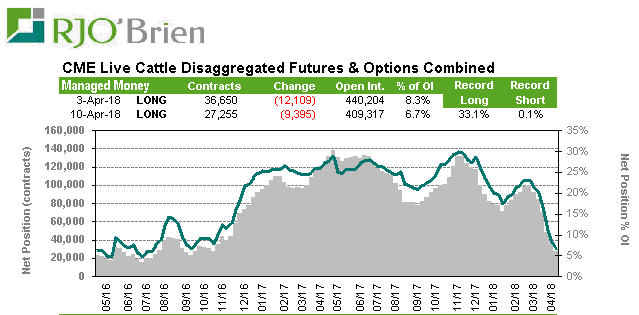 Le rapport des positions publié vendredi par le CFTC montrait que les spéculateurs étaient acheteurs net de 27 255 contrats, une diminution (vente) de 9 395 contrats sur la semaine du 4 au 10 avril. Les éleveurs, parcs et abattoirs étaient vendeurs net de 134 823 contrats, une baisse (achat) de 10 197 sur la semaine.