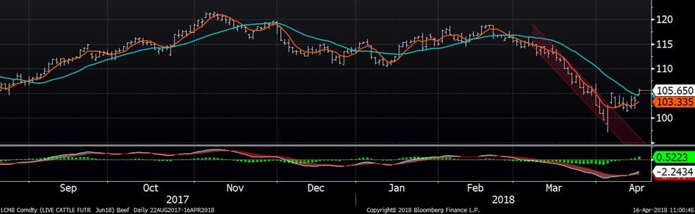 Le marché du bœuf rebondi fortement ce matin, en hausse de +2 ¢/lb sur juin, après que l’USDA ait répertorié des ventes cash à 120 ¢ au Kansas et Nebraska vendredi après-midi, même que certaines ventes ont atteint 122 ¢ au Nebraska. Le prix du bœuf demeurera sous pression à cause d’une hausse de production de 10% attendue au second trimestre. Ce vendredi, l’USDA publiera son rapport Cattle-on-Feed, les estimés du rapport seront publiés au cours de la semaine.