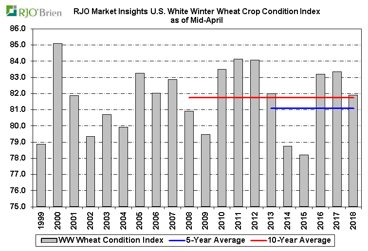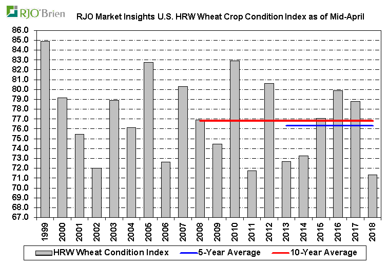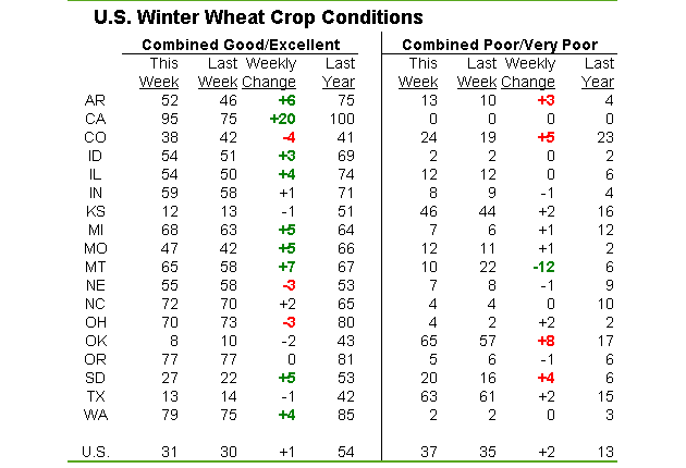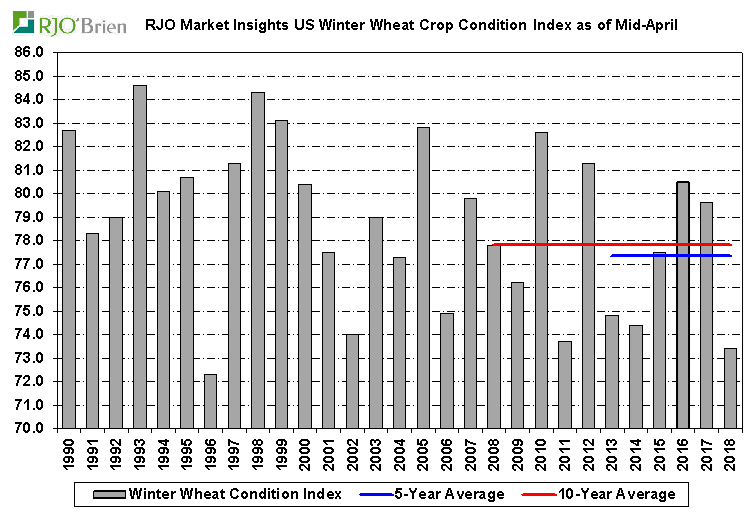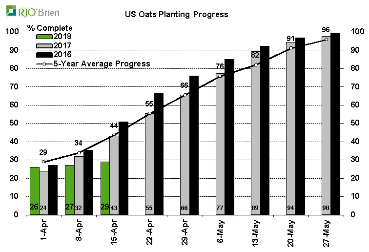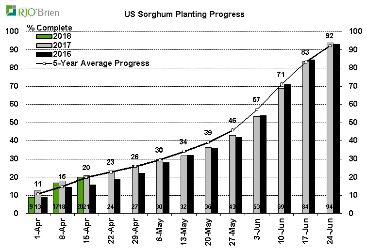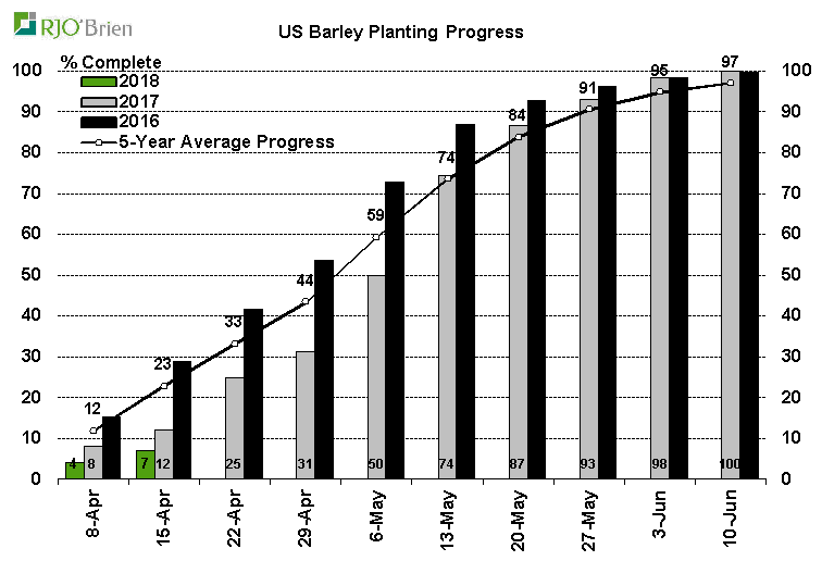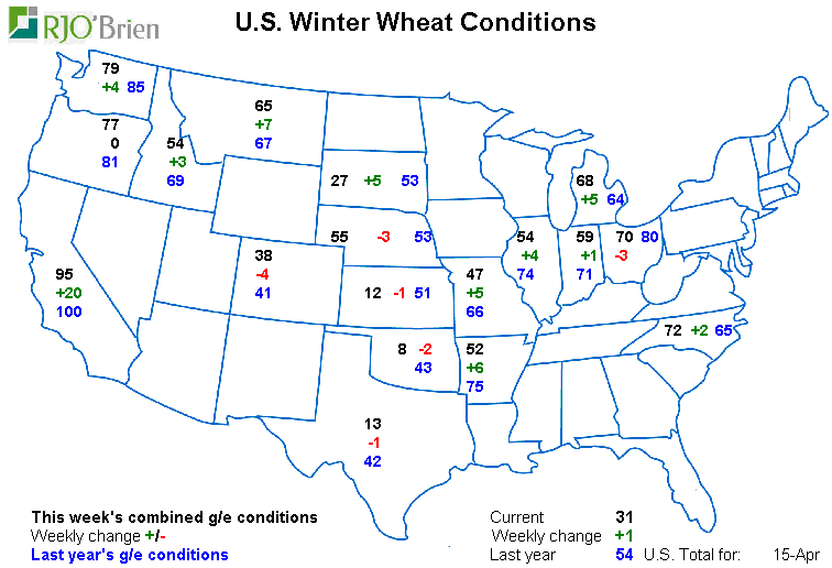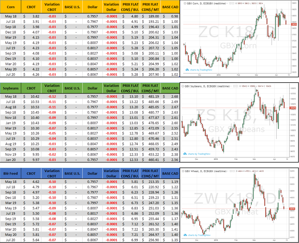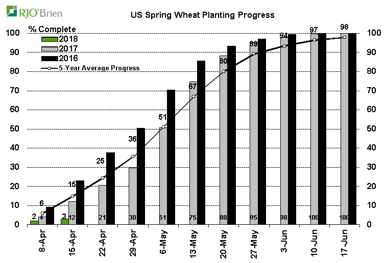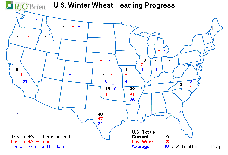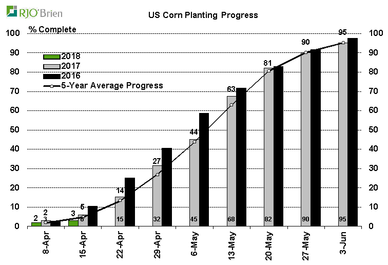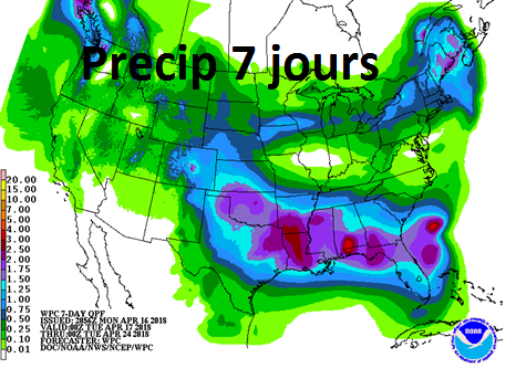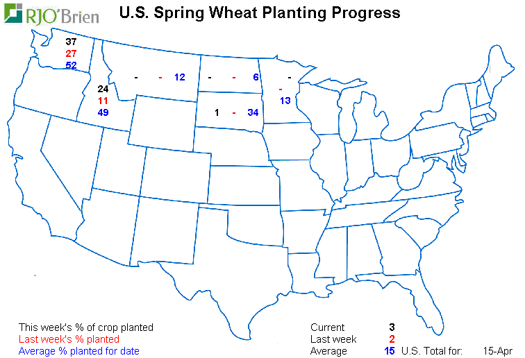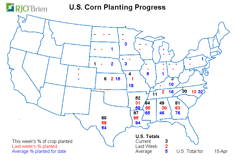 Début de semaine difficile pour le CBOT, principalement plombé par les prix du blé. Les forecast météo nous montrent de la pluie dans les régions sèches de blé d’hiver. Je pense que le marché fait l’argument que la pluie annoncé est plus bénéfique pour le blé que néfaste pour les semis de maïs (retard). Je suis d’accord. Le blé à 30% de bonne excellente condition a vraiment besoin d’une gorgée d’eau. C’est plus important que semé du maïs en avril. À priori il n’aura pas beaucoup de champ ensemencé au 1er mai, peut-être qu’à ce moment les investisseurs/utilisateurs commenceront à s’ajuster. Comme vous le voyez sur les cartes plus bas, à ce temps ci (mi-avril) c’est juste un départ et à peine 5% des surfaces de corn sont semé. Pas de panique. Dans le blé printemps ce n’est pas l’idéal non plus, juste 3% quand on s’attend à 15% et aussi on prévoit une augmentation de près de 1 millions d’acres cette année. Vont-ils y arriver? Vu qu’on est encore « de bonne heure » je pense que la bourse s’en préoccupe moins, mais plus le temps avance plus il faudra y faire attention.
