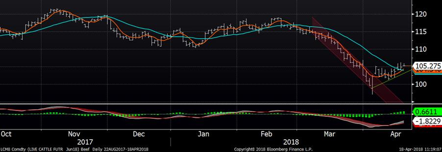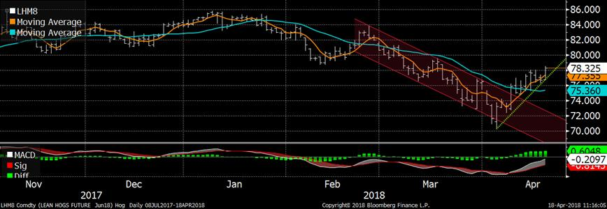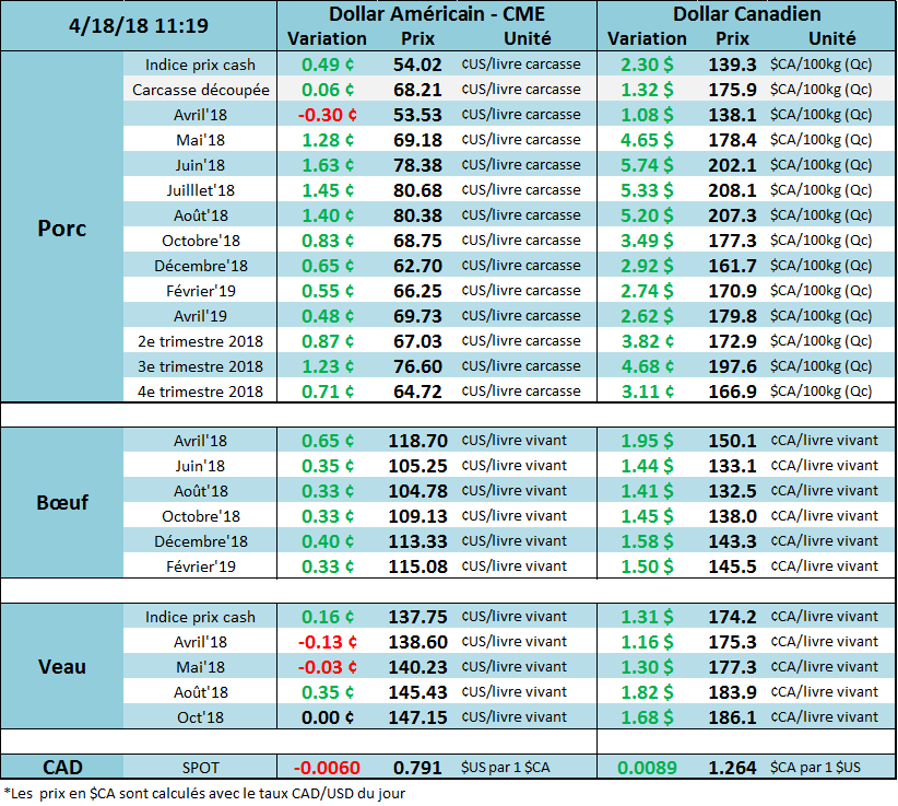 Hier, le contrat à terme de juin clôturait à 104.9¢/lb, en hausse de 0.72¢/lb. Il s’agit d’un escompte par rapport au prix cash de la semaine dernière qui se transigeait autour de 118-119¢/lb. Le prix pourrait subir des pressions haussières à moyen terme, car la mauvaise météo dans le nord du mid-ouest américain, particulièrement le temps froid et la neige de cette semaine, pourrait affecter la croissance des jeunes veaux. Par contre, à court terme, les fondamentaux restent négatifs avec une abondance de l’offre ce qui explique l’écart entre le cash et le CàT de juin. Les analystes s’attendent à une hausse de placement de 7.7% au 1er avril par rapport à 2017. Le rapport Cattle on Feed de vendredi devrait encore une fois nous confirmer l’amplitude de l’offre attendue au 2e trimestre.