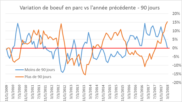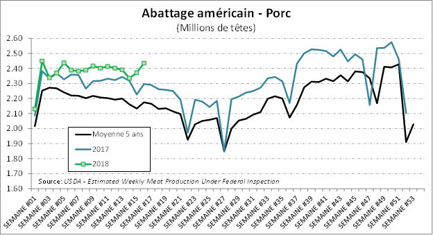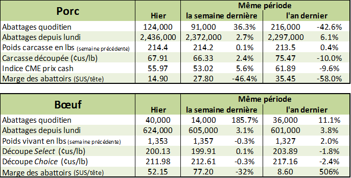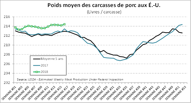 Vendredi dernier, l’USDA estimait que les abattages hebdomadaires étaient de 2.46 millions de têtes, en hausse de 6.1% par rapport à l’an dernier. Il s’agit également d’une hausse de 64 000 têtes comparativement à la semaine précédente. À court terme, cette abondance a probablement mis de la pression sur le prix des découpes. Le poids des carcasses, à 214.4 livres, continue de demeurer bien au-dessus de la moyenne saisonnière des 5 dernières années ce qui contribue à l’abondance de l’offre en plus de la hausse des abattages.