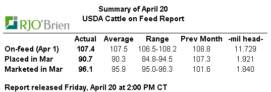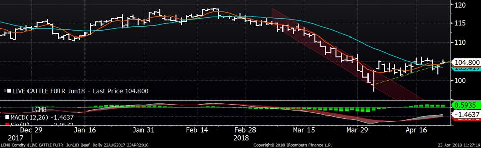 Le rapport sur les parcs d’engraissement de l’USDA vendredi était sans surprise et en ligne avec les estimés des analystes. En mars, les placements étaient 9.3% moindre que le volume de l’an dernier et les ventes étaient en baisse de 3.9%. En somme, la quantité de bœuf en parc d’engraissement était de 11.73 millions têtes au 1er avril ce qui est 7.4% supérieur à l’an dernier. Toutefois, cette augmentation se concentre explicitement sur les bœufs en parc depuis plus de 90 jours (+15.3%) tandis que les bœufs en parc depuis moins de 90 jours sont équivalents à l’an dernier (+0.2%). L’abondance de bœuf devrait donc se limiter d’avril à juin. Face aux résultats du rapport, le prix du bœuf de juin gagne 1.4¢/lb à 105¢.