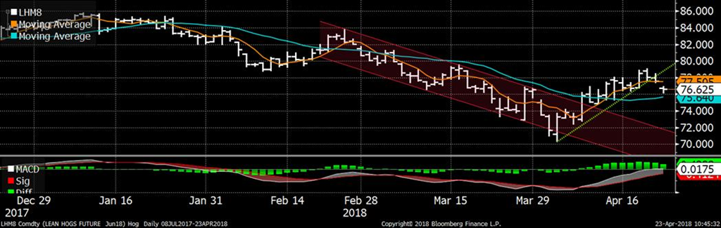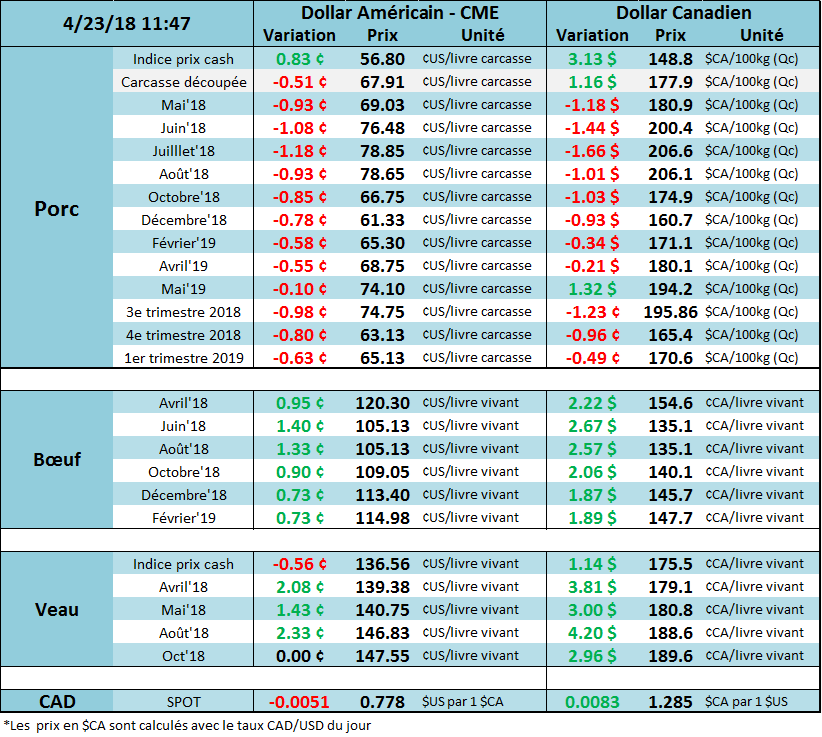 L’USDA estimait que les abattages étaient de 624 000 têtes la semaine dernière, une hausse de 19 000 têtes (+3.1%) comparativement à la semaine précédente et en hausse de 3.8% par rapport à 2017. La forte progression de l’offre attendue au cours du 2e trimestre continue de maintenir une pression sur le prix des contrats à terme d’été tandis que le prix cash demeure à 120 ¢/lb.
