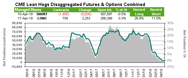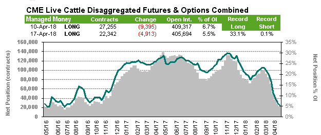 Le rapport des positions publié vendredi par le CFTC montrait que les spéculateurs étaient acheteurs net de 22 342 contrats, une diminution (vente) de 4 913 contrats sur la semaine. Les éleveurs, parcs et abattoirs étaient vendeurs net de 123 620 contrats, une baisse (achat) de 11 203 sur la semaine.