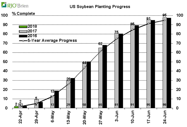 Soya : Il y a moins d’inquiétude dans le soya puisque c’est la dernière culture à être plantée. Il y a 2% des surfaces d’ensemencées ce qui en ligne avec les attentes mais légèrement en retard face à l’an dernier alors que nous étions rendu à 5% d’ensemencé.