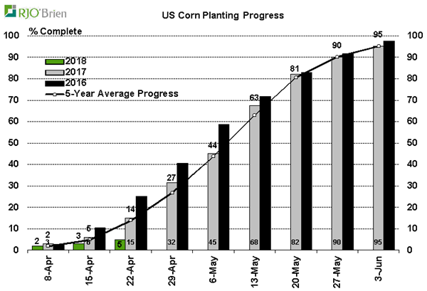 Bien que le marché s’attendait à un faible avancement dans les ensemencements aux États-Unis, les chiffres de l’USDA montent que la progression étaient plus lente qu’anticipée. Néanmoins, les prévisions pour la prochaine semaine semblent un peu plus sèches ce qui devrait permettre aux agriculteurs américains d’avancer les travaux aux champs, mais les conditions resterons loin d’être idéales avec de la pluie en milieu de semaine.