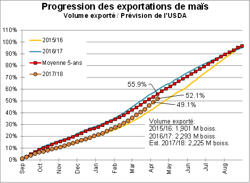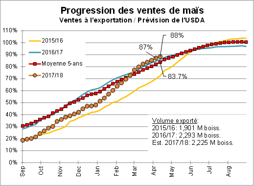 Cette semaine, les ventes américaines à l’exportation de maïs étaient plus faibles qu’anticipé à 620,500 tonnes (estimés à 1.0 – 1.6 MTM), notamment à cause d’une annulation nette pour la prochaine récolte avec des ventes à -76,000 tonnes du Japon. Ce sont les ventes à l’exportation les plus faibles depuis 15 semaines, malgré des achats de 386,000 tonnes du Mexique. Comparativement aux prévisions de l’USDA, à 2.2 milliards de boisseaux, il y a déjà 88% de ce volume de vendu ce qui représente environ deux semaines d’avance sur le carnet de commande habituel. Toutefois, on ne croit pas que l’USDA augmentera ses prévisions pour autant puisque les livraisons affichent un léger retard avec 52% du volume d’exporté.