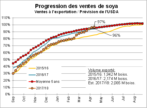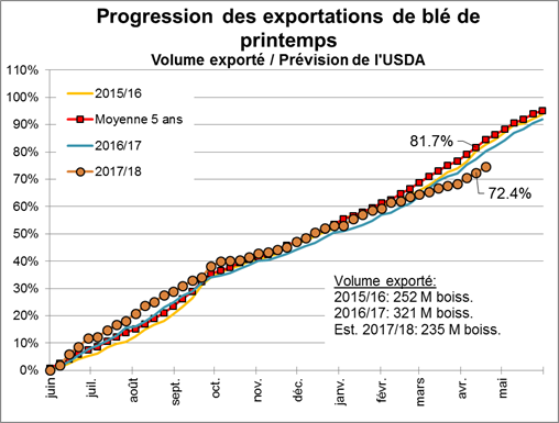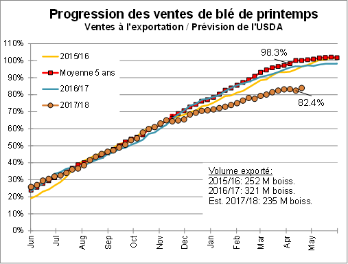 Les ventes de blé sont les seules qui ont surpassé les attentes avec 577,900 tonnes vendues, pratiquement moitié-moitié entre l’ancienne et la nouvelle récolte. Lorsqu’on regarde à l’ensemble des classes de blé, la progression des ventes (92%) et des livraisons (81%) sont en ligne avec la normale ce qui laisse croire qu’on s’en ligne pour réaliser les 925 millions boisseaux prévus par l’USDA. Toutefois, les ventes de blé de printemps (blé de Minneapolis) ne parviennent pas à rattraper le retard et ça ne serait pas surprenant de voir l’USDA couper ses prévisions par 25 M boisseaux si la situation ne change pas. Le retard dans les livraisons est moins important (72% exporté vs 82% en moyenne), mais reste cohérent avec une coupure de 25M boisseaux.