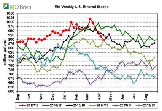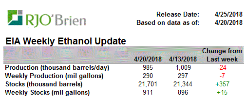 La semaine dernière, le déclin saisonnier dans la production d’éthanol continuait alors que la production atteignait le plus bas volume en 28 semaines. La production devra rebondir durant la période mai/juin comme c’était le cas l’an dernier pour être en mesure de rencontrer les objectifs d’utilisation de l’USDA. Malgré une légère hausse des inventaires, ceux-ci continuent d’être 7% plus élevés qu’à la même date l’an dernier, à 911 millions de gallons.
