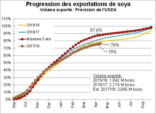 Pour le soya, les ventes à l’exportation étaient également décevantes, particulièrement sur la prochaine récolte, ce qui donne un total vendu de 537,800 tonnes (estimés de 800k à 1.4 MTM). On ressent le boycottage de la Chine qui a annulé 10,000 tonnes sur l’ancienne récolte et n’a rien acheté sur la nouvelle production. Face au 2.065 milliards de boisseaux anticipés par l’USDA, les ventes de l’ancienne récolte n’affiche aucun retard comparativement à la normale, mais les livraisons oui! En moyenne, il devrait y avoir environ 88% des exportations cibles qui ont déjà quittées le continent, mais on n’est seulement à 76% (versus 75% la semaine dernière), il y a donc du retard dans les livraisons. Cela signifie qu’il y a beaucoup de commandes qui ne sont pas encore expédiées ce qui représente un risque d’annulation alors que la récolte du Brésil est pratiquement terminée.