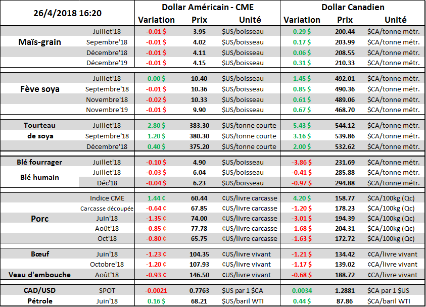 Cette semaine, le huard perdait des plumes malgré des rumeurs positives concernant un accord prochainement sur l’ALENA. En fait, c’est plutôt que le dollar américain s’est apprécié davantage relativement au canadien. Cette semaine, le rendement des obligations de 10 ans aux États-Unis a franchi la barre symbolique des 3% ce qui a poussé le billet vert vers le haut versus l’ensemble des devises dont le huard. Aujourd’hui, le dollar de juin se transigeait à 77.77 en milieu de journée (les 7 sont frimés!). Il ne serait pas surprenant de voir Poloz changer le ton concernant les futures hausses de taux d’intérêt après un renouvellement de l’ALENA ce qui pourrait donner de la force au dollar d’ici quelques semaines.