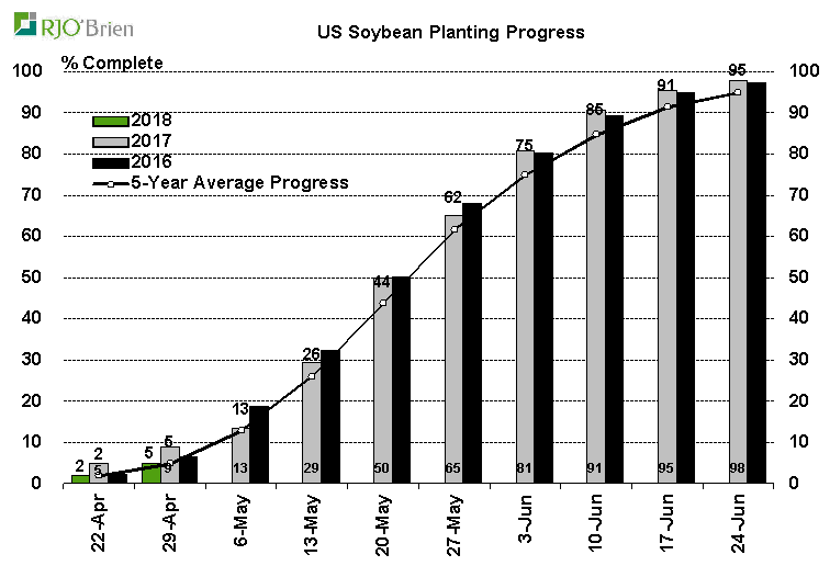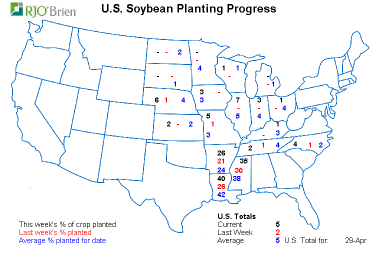 - Soya américain : 5% de planté, en ligne avec les attentes ; 9% l’an dernier; 5% en moyenne