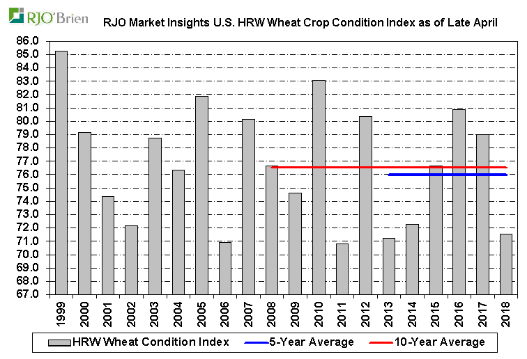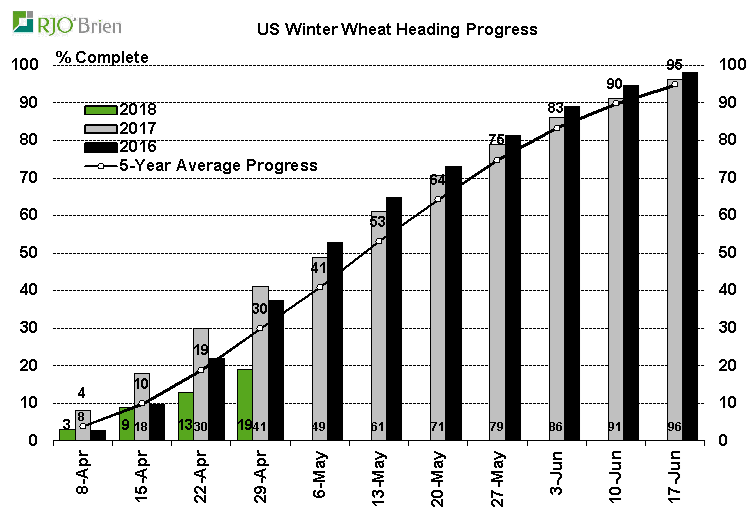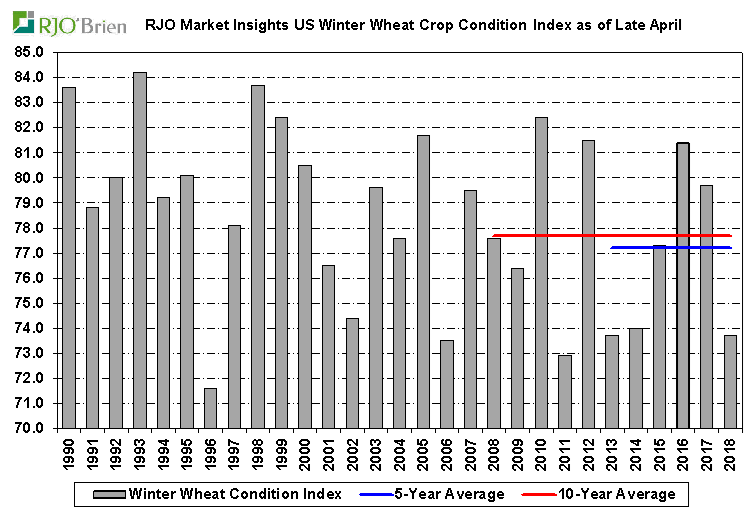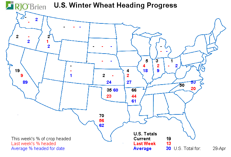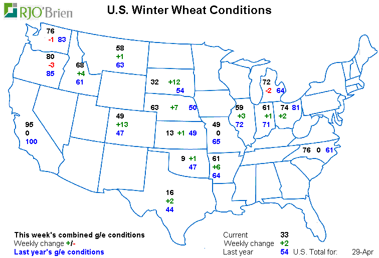 - Blé d’hiver américain : 33% bon/excellent +2% vs la semaine dernière; 54% l’an dernier