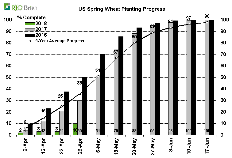 - Blé de printemps : 10% de planté; 3% la semaine dernière; 30% l’an dernier; 36% en moyenne