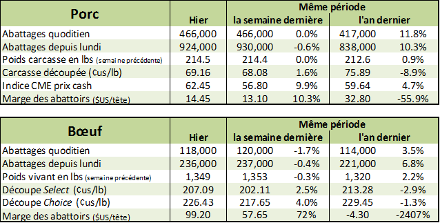 Mardi, les estimés d’abattages de l’USDA étaient de 466 000 têtes, inchangés comparativement à la semaine dernière. Cela porte le total pour le début de la semaine à 924 000 têtes, en baisse de 6 000 têtes par rapport à la semaine dernière, mais en hausse de 10.7%, ou 89 000 têtes comparativement à l’année dernière. À ce temps-ci de l’année, nous devrions observer une baisse des abattages qui ne semble pas ce manifester, causant une incertitude sur le marché.