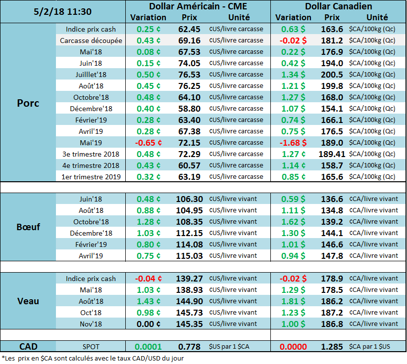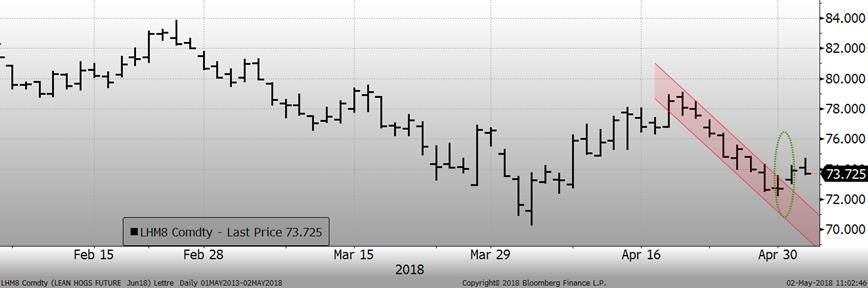 Hier, le porc de juin gagnait 1.20¢/lb pour clôturer la séance à 73.90¢/lb. Techniquement, c’est un mouvement assez positif puisque le prix est sorti du canal baissière dès l’ouverture, en formant un « gap ». Cela pourrait être le début d’un changement de tendance pour une nouvelle ascension vers de nouveaux sommets. Par contre, les mois de juillet et d’août n’avaient pas la même trajectoire haussière, restant plutôt inchangés (juillet +0.15¢/lb, août 0.07¢/lb) malgré un gain de presque 1¢ en après-midi. Le marché s’attend encore à une remontée saisonnière du prix cash, car les contrats de juin continuaient de se négocier avec un écart positif avec le prix carcasse. Hier, le prix cashpublié ce matin était de 62.84¢/lb (indice CME à 62.66 demain matin), pour d’une différence de 11¢/lb avec le porc de juin. Le prix des découpes quant à lui n’a toujours pas franchi la barre psychologique des 70 ¢/lb. Nous sommes d’avis que le rallie saisonnier ne pourra pas réellement se mettre en branle avant que ce niveau soit franchi. Il semble qu’il faudra encore user de patience cette semaine, en attendant l’arrivée du beau temps qui devrait aider la demande de porc.