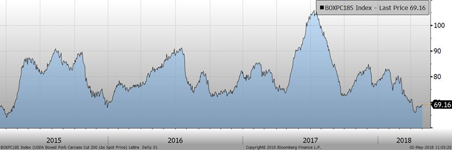 Le prix cash du bœuf a explosé au cours des dernières semaines pour atteindre un niveau seulement atteint à la fin de juin l’an dernier. Le prix cash continue de bénéficier d’un niveau relativement faible d’abattages et d’une demande soutenue. Hier, les CàT de juin et août perdaient 0.45¢/lb et 0.37¢/lb, à 104.08¢/lb et 107.08¢/lb respectivement. Les parcs offrent les bœufs à 126 ¢/lb ce qui serait environ 4¢ de plus que la semaine dernière, mais aucune vente n’a été faite à ces prix. C’est dire que la différence entre le bœuf de juin et le prix cash demeure tout de même élevée. Cela devrait supporter la valeur du contrat de juin à court terme, en attendant cette hausse tant attendue de la production au 2e trimestre. Le danger est que l’augmentation de production qu’on n’observe pas en ce moment, expliquant le prix cash élevé, se retrouve condenser en mai-juin ce qui causerait une importante production. C’est ce qui explique la faiblesse de juin à court terme.