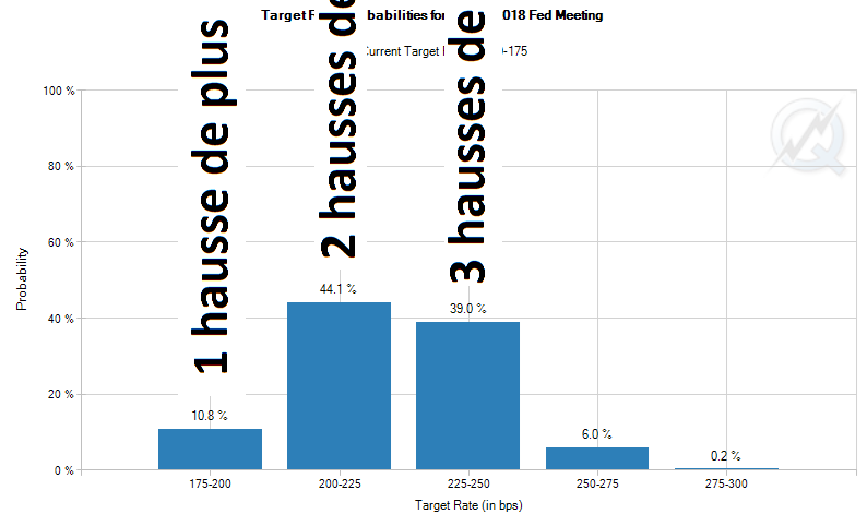 1) Le protectionnisme américain...... ca crée de l'inflation. Les américain s'isolent de plus en plus dans leur économie. L'emploi roule full pinne, les salaires augmente le cout de la vie aussi. C'est l'inflation. La FED controle l'inflation avec des hausses de taux. Bingo. Les prévisions de hausse de taux aux States sont plus élevées aujourd'hui qu'il y a un mois. On est à 1.50-1.75% aux USA et le marché hésite entre 2 à 3 hausses de plus (Total 2018 entre 3 et 4)
