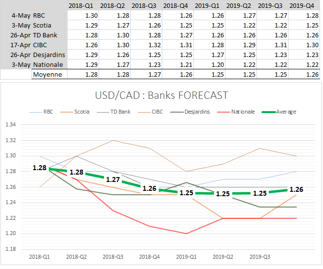 Et les banques elles? Je suis un peu surpris... les banques canadiennes s'attendent à un dollar cad plutot fort pour la fin de l'année. Dans leur dernière projections on vise plutot 1.26 pour le dernier trimeste de 2018 (on est quasiment à 1.30). Bon ok j'ai déjà été plus surpris ca dans ma vie je ne suis pas si plate que ca ok.... j'ai des hobby plus cool que de passer des heures devant l'ordi.