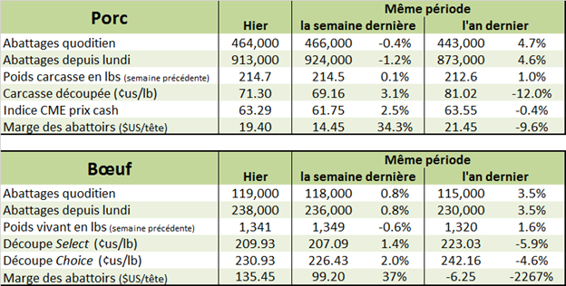 Mardi, les estimés d’abattages de l’USDA étaient de 464 000 têtes, en baisse de 2000 têtes sur la semaine dernière. Cela porte le total pour le début de la semaine à 913 000 têtes, en baisse de 11 000 têtes par rapport à la semaine dernière, mais en hausse de 5.7%, ou 50 000 têtes comparativement à l’année dernière. Depuis deux semaines, bien que modeste, nous observons le ralentissement du rythme des abattages qui est généralement observé à ce moment de l’année. Si le ralentissement saisonnier se confirme et s’intensifie, la diminution de l’offre devrait avoir un effet positif sur les prix.
