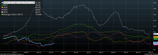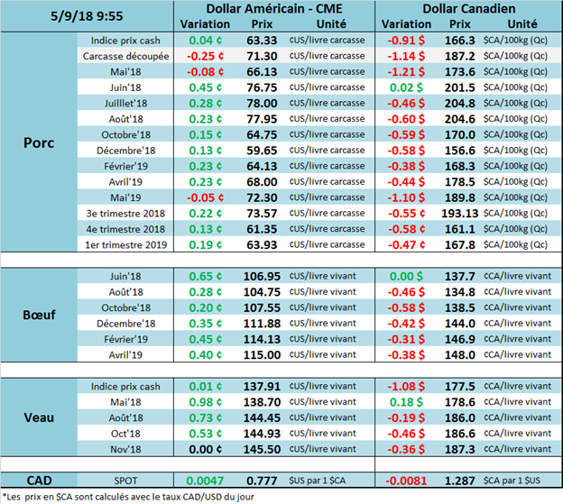 Le bœuf de juin clôturait en hausse de 1.12¢/lb hier, à 106.93¢/lb. Il semble que le marché anticipe maintenant que les effets de l’abondance de l’offre prévue se feront davantage sentir après juin. Le contrat d’août, à 104.48¢/lb, se maintient en dessous des niveaux de juin et d’octobre. Malgré une différence importante entre le bœuf de juin et le prix cash, celui-ci demeure tout de même élevé et continue de supporter le CàT de juin. Le prix cash continue de bénéficier d’un niveau relativement faible d’abattages et d’une demande soutenue. Le danger est le bœuf soit envoyé à l’abattoir au même moment, ce qui pourrait entrainer une dégringolade du prix cash et entraîner les contrats à termes pour les mois d’été dans son sillage.