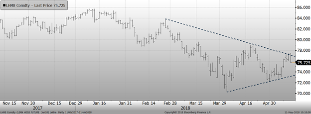 Je pense que c’est possible d’être optimiste pour un nouveau rallye de printemps pour les prix cash. Lorsque les grillades BBQ vont se mettre en place, cela devrait aider les valeurs des longes. C'est tempéré par les poids des bêtes encore 2.1 livres plus lourd qu'il y a un an alors que les packers ralentissent sur l’abattage. Je pense qu’il y a un potentiel haussier sur le prix cash (saisonnier). Les futures de juin arrivent à grand pas et l’écart entre le cash et juin est encore à près de 11 cents bien dessous des moyenne pour la mi-mai. Il va falloir que le cash monte rapidement afin de supporter les contrats de juin. La zone Iowa/Minnesota tire le cash encore à la baisse avec un escompte de 1-2$ sur l’indice.