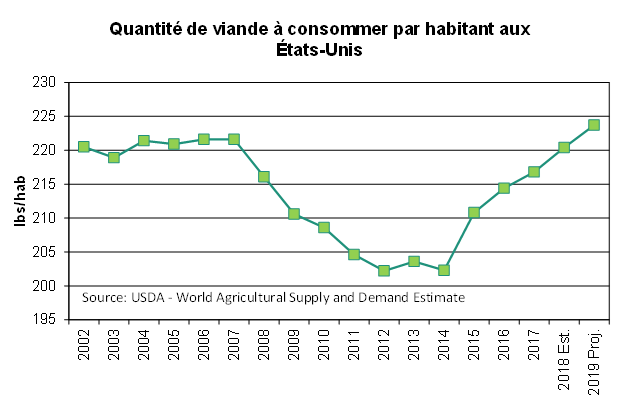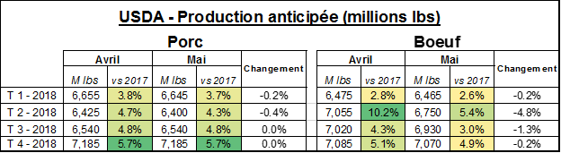 Jeudi, l’USDA a pratiquement laissé inchangé ses estimés de production pour les trimestres à venir dans son rapport d’Offre et Demande (WASDE). La production pour le 3e et le 4e trimestre était estimée à +4.8% au 3e trimestre et +5.7% au 4e trimestre. Globalement, les américains devront manger beaucoup de viande, car l’offre locale s’établira à 220.4 lbs /habitant en 2018 (en baisse de 1.1 lbs/habitant versus le rapport d’avril), en ligne avec l’offre de 2006 et 2007 qui était de 221.6 lbs/hab. Cette offre de viande est constituée de 58.1 lbs de bœuf, 51.9 lbs de porc, 1.2 lbs d’autres viandes rouges, 109.2 lbs de poulet, 16.1 lbs de dinde par habitant. Nous émettons toutefois des réserves face à la projection de l’USDA pour 2019. Selon l’USDA, l’offre locale devra continuer d’augmenter en 2019, ce qui établirait de nouveaux niveaux au-delà de 222 lbs/habitant.