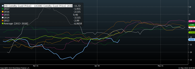 La faiblesse du cash et la convergence avec les CàT de juin est ce qui explique la faiblesse du LH aujourd’hui à -2cents sur les contrats rapproché de juin (vs -0.750 déc).