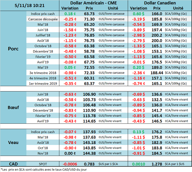 Hier, le prix du contrat de juin gagnait 1.85¢/lb à 107.53¢/lb et perdait un peu de terrain aujourd’hui. Le marché semble avoir regagné de l’optimisme avec une offre de bœuf attendue moins importante que prévue initialement. Le prix des découpes est également un facteur positif qui démontre la force de la demande ces derniers jours. Hier, le Choice gagnait 0.11¢/lb, pour atteindre 231.07¢/lb, le plus haut niveau depuis la fin juin 2017. Le prix cash était près de 120 ¢/lb au Nebraska et au Texas cette semaine.