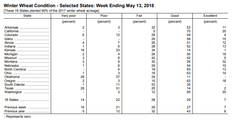 - Blé d’hiver américain : 36% bon/excellent +2% vs la semaine dernière; 51% l’an dernier