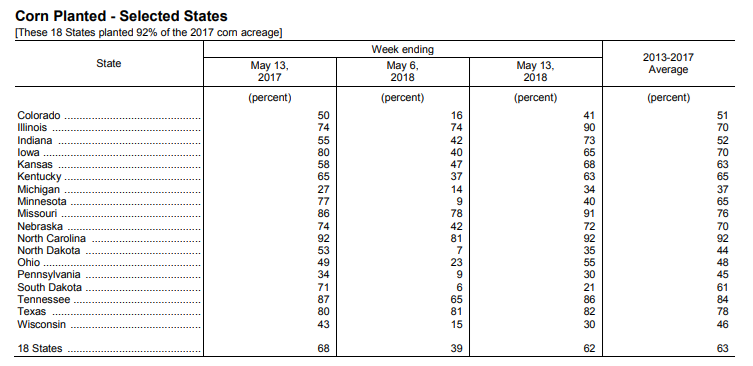- Maïs américain : 62% de planté ; 39% la semaine dernière; 38% l’an dernier; 63% en moyenne