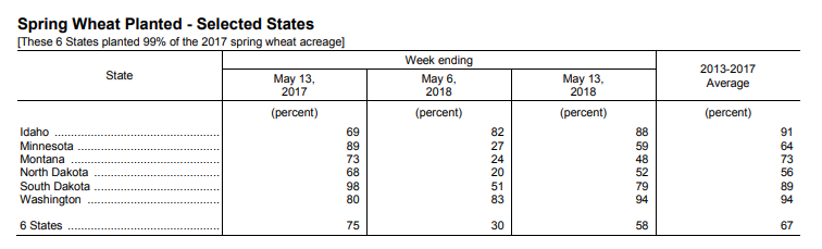 - Blé de printemps : 58% de planté; 30% la semaine dernière; 75% l’an dernier; 67% en moyenne