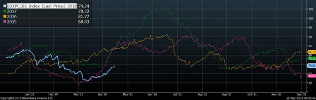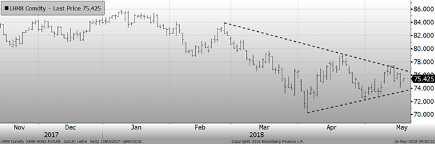 Hier, le porc de juin clôturait sous la barre des 75¢/lb, à 74.73¢/lb. Les contrats à terme reculaient pour l’ensemble des mois d’été : juin -1.42¢/lb, juillet 1.02¢/lb et août 0.92¢/lb. Techniquement, le prix est de retour sur son support dans la zone des 73-74¢/lb. Une bonne nouvelle est que le prix cash continuait de monter. Hier, l’indice du prix cash CME publié ce matin était de 65.23¢/lb, comparativement à 63.33¢/lb la semaine dernière, une hausse de 1.9¢/lb. Il reste tout de même pas mal de chemin à faire, car le CàT de juin se transige à 9.5¢/lb d’écart avec l’indice CME. Plusieurs éléments politiques dont L’ALENA et les négociations commerciales avec la Chine pourraient encore affecter la remontée saisonnière du prix cash.