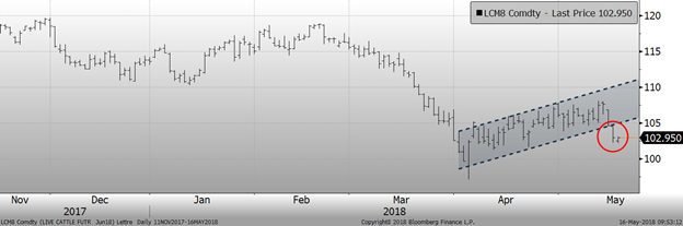 Mardi, le bœuf de juin terminait en baisse de 1.65¢/lb hier, à 102.98¢/lb. Il s’agissait du plus bas niveau depuis le 11 avril. Les contrats d’août et d’octobre perdaient 1.50¢/lb et 1.52¢/lb respectivement. Le prix cash tournait autour de 116¢/lb cette semaine au Nebraska, en baisse de 4¢/lb, par rapport à la semaine dernière et de 10¢/lb rapport à il y a deux semaines. Il semble que le marché ait déjà inclus la glissade du prix cash dans le prix des contrats à terme.