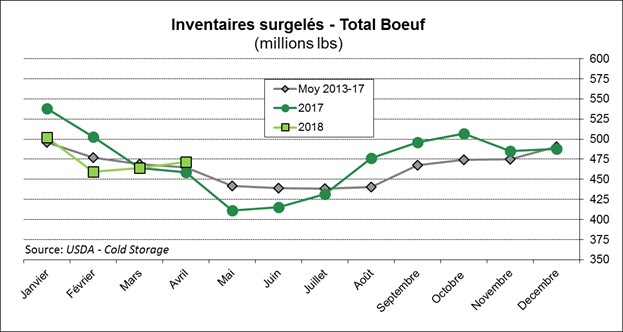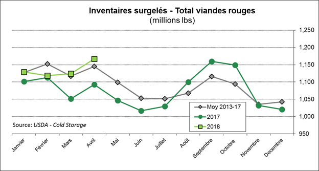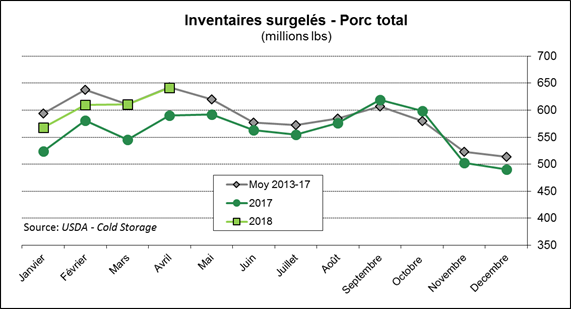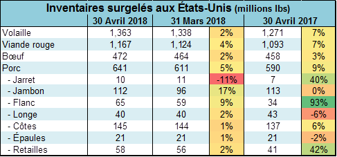 Selon le dernier rapport sur les inventaires surgelés, il y avait 9% plus de stock de porc qu’en avril 2017. Les inventaires de flanc sont particulièrement élevés comparativement à l’an dernier (+93% versus 2017), mais il s’agit d’une comparaison favorisée par des inventaires anormalement faibles l’an dernier. Pour ce qui est des retailles (+42% versus 2017), historiquement, les niveaux auraient dû commencer à diminuer. Cependant, c’est l’entrée en vigueur en avril des tarifs commerciaux de la Chine, plus grand importateur de retailles de porc américain, expliquant la hausse des stocks suite à la diminution des exportations américaines de retailles qui se sont accumulé dans les frigos.